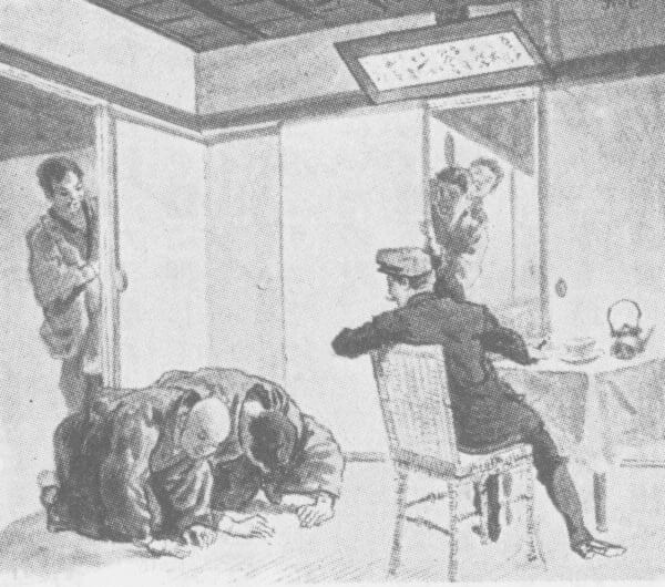 こういうこまった欧米人がえがかれたイラストを一点、紹介しておこう。「望ましくない訪問者」と題された挿絵である。土足で畳にあがりこんだ西洋人が、旅館のスタッフにおうへいな口をきいている(図1)。