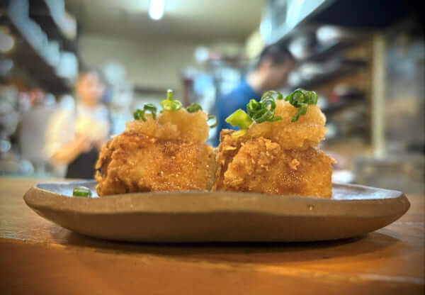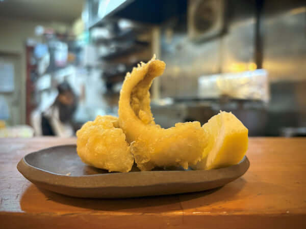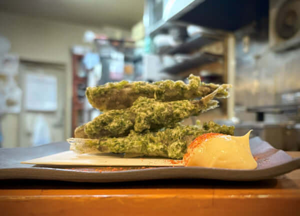 カウンターに座った皆さんはやはり近所に暮らしているそうで、かなりの頻度で通っているという。そこへまた常連の、近所にアトリエをかまえるアーティストの方がM夫さんの隣りに座り、しばしアート談義。私はというと、小上がりへと徳利を持って出張。実は子連れの女性、女将さんなのであった。そして一緒にいて旨そうに肴をつまんでいた小学生のお嬢さんは看板娘なのであった。束の間歓談、大将と女将、二人の馴れ初めから聞いているうちに徳利が空になる。そこへちょうどめひかりが出来上がったと声がかかる。カウンターに戻り、熱々をいただく。アオサをまぶした衣をまとっためひかり、アオサ・アロマと揚げた衣のいいにおいが混ざり合って最高に食欲をそそる。大胆に頭からガブリといく。じわっと汁気があふれる。小脂と品のいい身の甘みが衣との相性は抜群で、この先、めひかりはこの食べ方に限りたい、とすら思わせた。