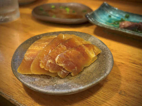 しばらくしみじみと呑んでいるうちに、自家製のカラスミがあると聞き、頂戴した。ボラの卵巣がどうしてこんなに旨い珍味に仕上がるのか。出されたそれは、塩加減は「よかったら飲んでください」というぐらいに絶妙に控えめで、むっちりコク深く、仄かな磯の香りの奥から、どこか果物のようなさわやかな甘みを感じさせた。