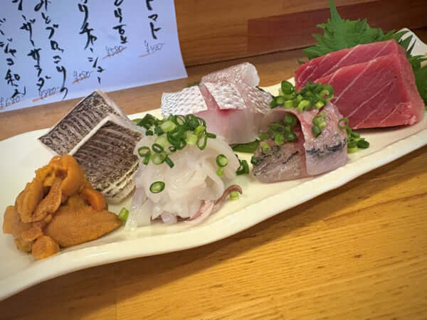 まずはお刺身。鮪に鯵、イカに鯛に雲丹…盛り合わせをおねがいしたら、美味しいお魚大図鑑みたいな一皿が現れた。それぞれきちっと仕事がしてあって、一見して「やるわね」と唸らせる刺身の盛り合わせである。これを見て、私の脳は反射的に