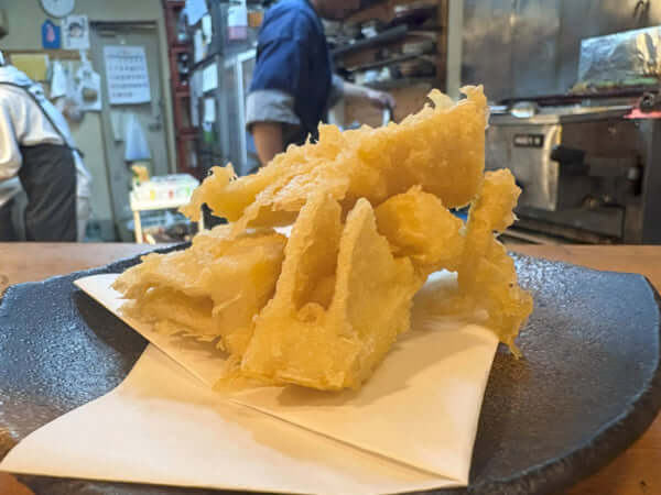 万が一、ジャバの唐あげに困惑した際のリリーフ役にお願いした穴子はというと、これはもう、間違いの無い味わいであった。ただ、大将の揚げものの腕の良さは、こういう普段食べ慣れた素材でこそ、グワっと明確になる。カラッとしているのはもちろん、衣と穴子の身の一体感たるや、傑作であった。はたして、ここまでですでに三合ほど吸い込んでいる。そして、あろうことか、さらに揚げもの、めひかりの磯辺揚げをこっそりとアルバイトの女性に頼んでしまったのである。
