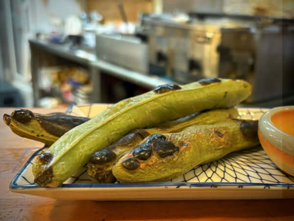 すぐに出てきた筍の天ぷらは、サクサクの衣のなかから、エグ味ゼロで爽快な香りとかすかな甘みをたたえた筍が顔を出す瞬間、M夫さんと顔を見合わせ、黙ってうなずく。サイレント・スプリング(レイチェル・カーソンの書名だけれど、そういう意味ではないことは承知しております)。つづく焼きそら豆は、食べる前から香りに心を奪われ、熱いのをアチアチとおじさん二人で言い合いながら一粒ずつ大事にいただいた。そら豆の、そら豆にしか感じられないあの甘みが、ふわっと口中で広がる。たまらない。時折、蕗のおひたしをアクセントみたいにつまむ。シャキシャキの蕗を噛むといいだし汁がほんのり苦味をともなった蕗の汁とまざって、これまた酒が進む。