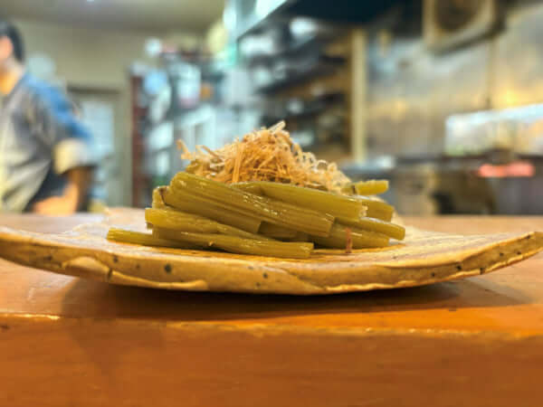 店主の野村幸也さんがカウンターの奥から笑顔で迎えてくれた。これほど粋に作務衣を着こなす四十代を私はほかに知らない。口開けから少し時間を過ぎていたものの、てっきり一番乗りだと思い込んでいたら、すでにお客さんが三人もいた。しかも、もうすでにいいメートル加減である。追いつかねばならない。
