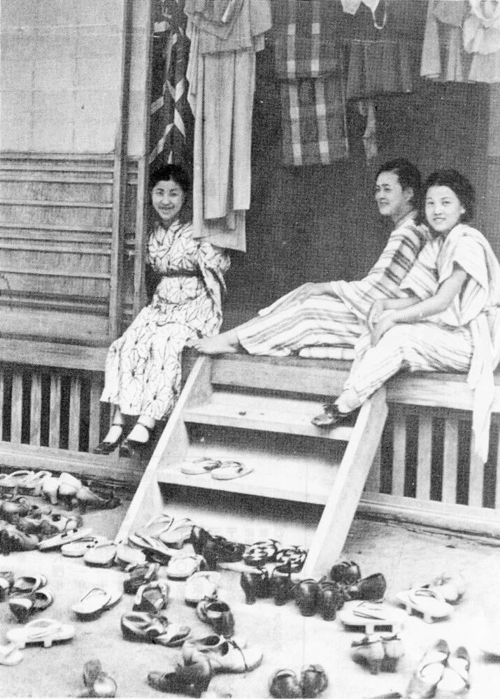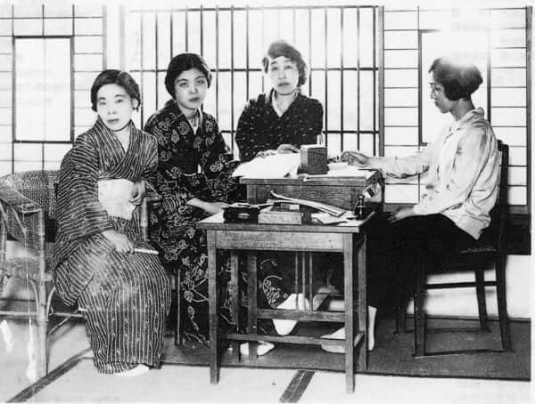 『女人芸術』という雑誌が刊行されだしたのは、1928年からである。長谷川時雨や生田花世らがひきいる、フェミニズムの先駆的な媒体であった。しかし、オフィスへは、靴や草履などをはかずにあつまっている。イスやテーブルはそろえていた。それでも、床は畳である。彼女たちも、足袋や靴下で机にむかわざるをえなかった(図10)。