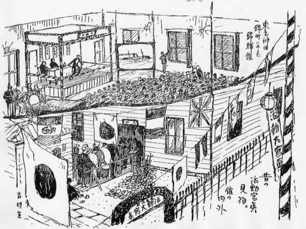 かつて、東京の神田錦町に、錦輝館という映画館があった。あるいは、当時の言葉にしたがい、活動写真館と言うべきか。19世紀末に出現し、関東大震災でついえさった。その様子を、おさないころからかよった吉川速男が、回想的に図示している。