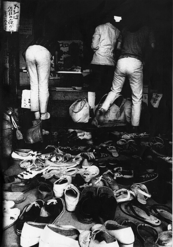 さらに、あと一点、1971年にとられた写真をひいておく(図13)。この年、8月21日から4日間、ウーマン・リブのいわゆる「大合宿」がひらかれた。会場となった長野県飯山市には、千二百人が参加したという。さらに、土足だとあがれない施設でも、彼女らは集会の場をもった。そういうところでは、写真のように靴があふれかえることとなる。
