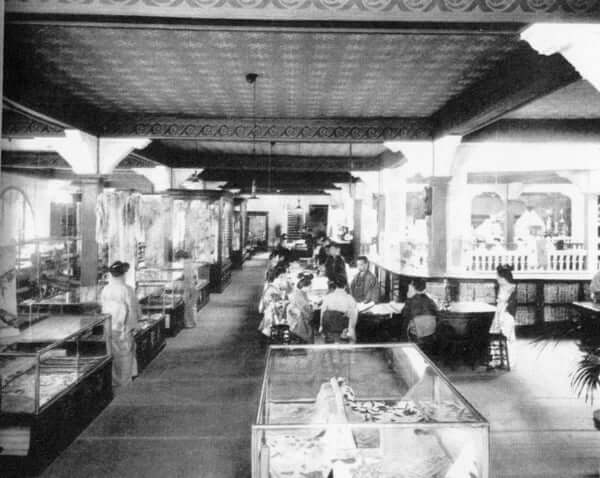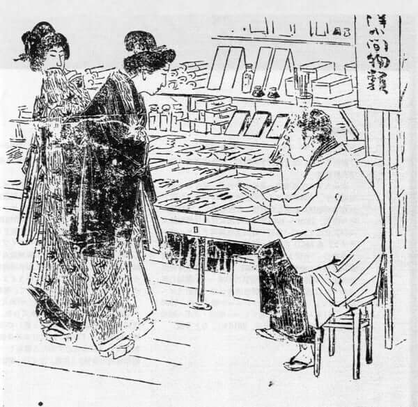 見れば、店員と客が畳の上でむきあっている。伝統的な呉服商での慣行が、そのままたもたれていたようである。こういう場に、外国人はべつとして、外履きであがりこむのは、だれしもはばかろう。