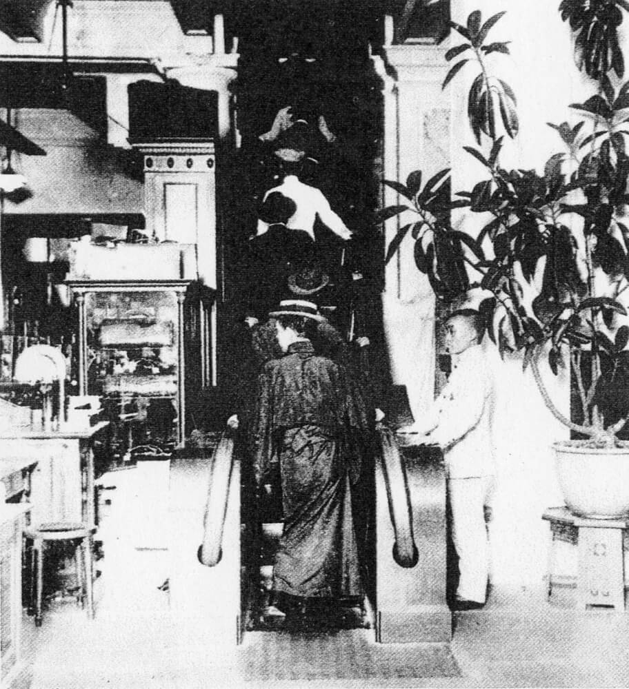そう言えば、1914年の三越は店内にエスカレーターも、もうけている(図3)。裸足や足袋、あるいは靴下のままだと、あぶなっかしい。エスカレーターを導入した以上、土足客の歓迎にふみきらざるをえなかった。じっさいにはその逆で、土足をうけいれたから、エスカレーターも設置できたのだが。