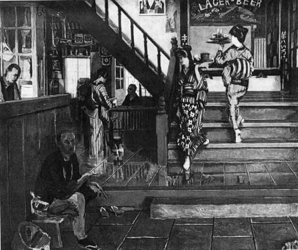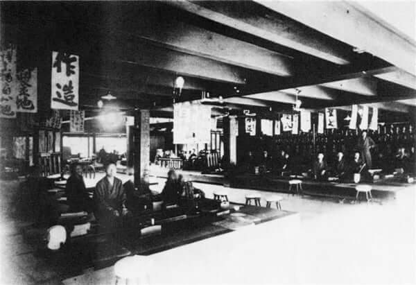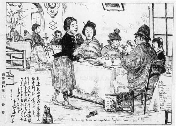 1887年2月28日の光景、ディナーの様子であったという。来客は外履きをぬぎ、スリッパで食事をたのしんだ。ウエイトレスも靴をはかず、足下は靴下だけという姿で給仕につとめている。