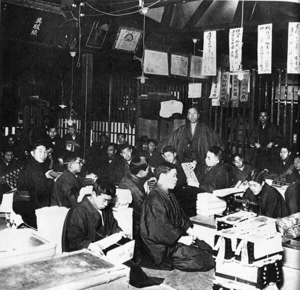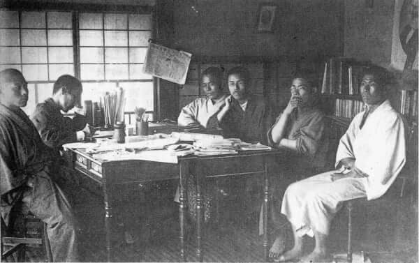 週刊の『平民新聞』は、1903年に刊行されだした。時代にさきがけた社会主義者やアナーキストたちのメディアである。幸徳秋水や堺利彦、そして石川三四郎らがたちあげた。そのオフィスを、彼らは東京の有楽町においている。家を一軒かりての発足だが、編集部の様子をのぞいてみよう(図9)。