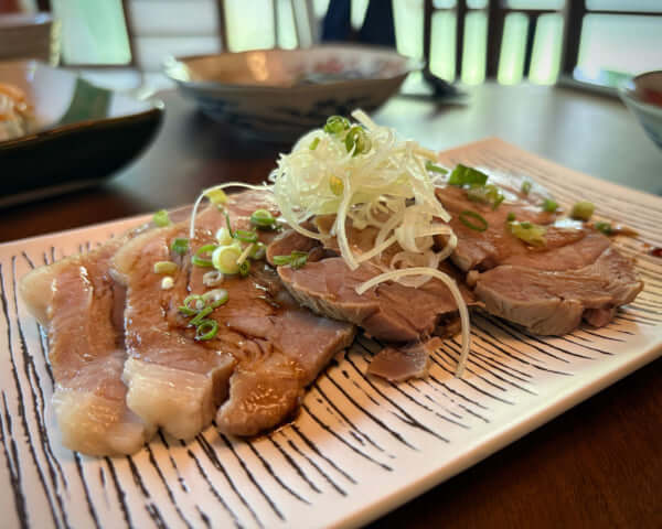 中華な流れになったので、さらに自家製のチャーシューを頼んだら、これがまた傑作でホロホロの肉に甘くてしっとりした脂身が最高のバランス。モグモグやると、1、2、3で消え去っていき、すぐにも「もう一枚!」と、後を引く旨さ。薬味のネギのよき辛味の刺激と香りも良い働きをしていて、一緒に食べると、一層、肉と脂身のバランスが際立つ。