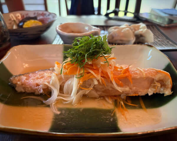 そして鮭の南蛮漬け。私は近年南蛮漬け探求家も自称しているが、これは一口で快作であると膝を叩いた。薄い衣と馴染んだ鮭の身は、汁気をちゃんとたたえつつ、酸味、塩味、甘味を至妙の比率で仕上げた漬け汁にしっかりと浸かり、一体化している。漬け汁は鮭の元々の旨みをぎゅっと引き出し、衣のかすかな甘味と香ばしさがアクセントになり、まるで自然界に、こういう味の魚がいるかのように、自然に一塊になって味覚を満足させる。たまらない。