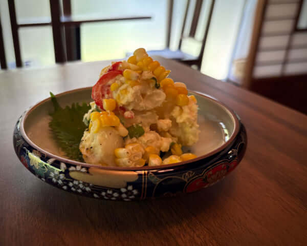 ほどなくして現れたのが例の三品。ここのポテトサラダは日替わりといっていいほど姿を変える。その日のは、ジャガイモはシャキシャキッの歯触りをほんの少し残したいいホクホク茹で加減。パプリカの爽やかな汁気と店で芯から削いだコーンの甘さと心地よい歯応えがいいバランスで、ビールとの相性は、獅子てんやわんやくらいピッタリである。