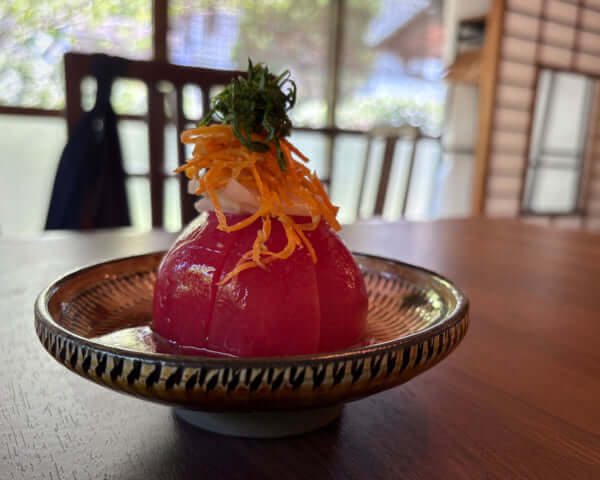 トマトのおひたしは、丸ごとをそのまま出汁に浸してあって、湯剥きされたトマトの表面までほどよい塩気の出汁がしっかり馴染んでいる。薬味の香り高いシソと一緒に食べると、トマトの酸味と甘味が一層際立つ。