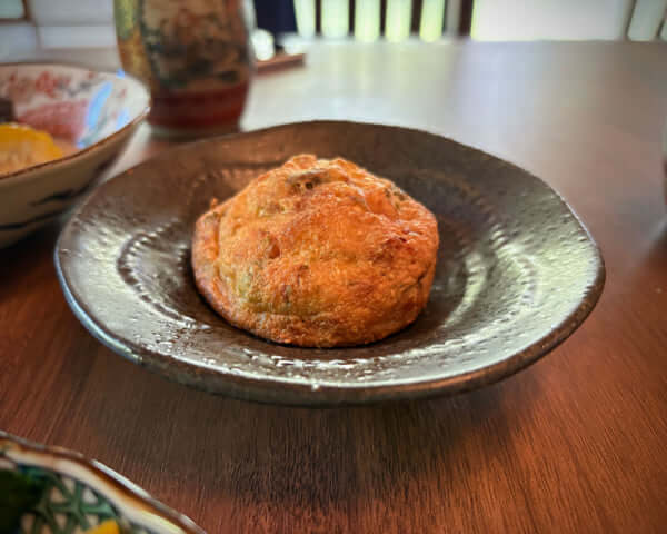 ツマミはだんだんに重みのあるものにしていく主義なので、ここで大好物の雁もどきをお願いする。自家製のそれは、表面をカリカリに仕上げていて、まず一嚙み目から、そのサクサクとした歯触りにしびれる。具もたっぷりで豆腐界の福袋みたいな逸品であった。おのあたりですでにお銚子3本がエンプティ。