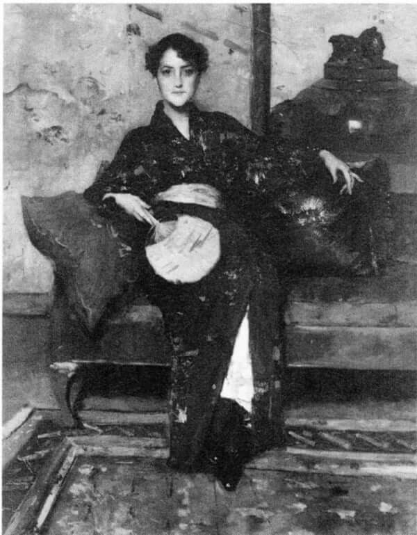 そのひとつに、「青い着物」というアメリカの絵をあげたい。ウィリアム・メリット・チェイスが、1880年代のおわりごろにえがいた。図1に、これをしめしておく。衣裳のみならず、調度品も日本からもたらされていたことが、よくわかる。