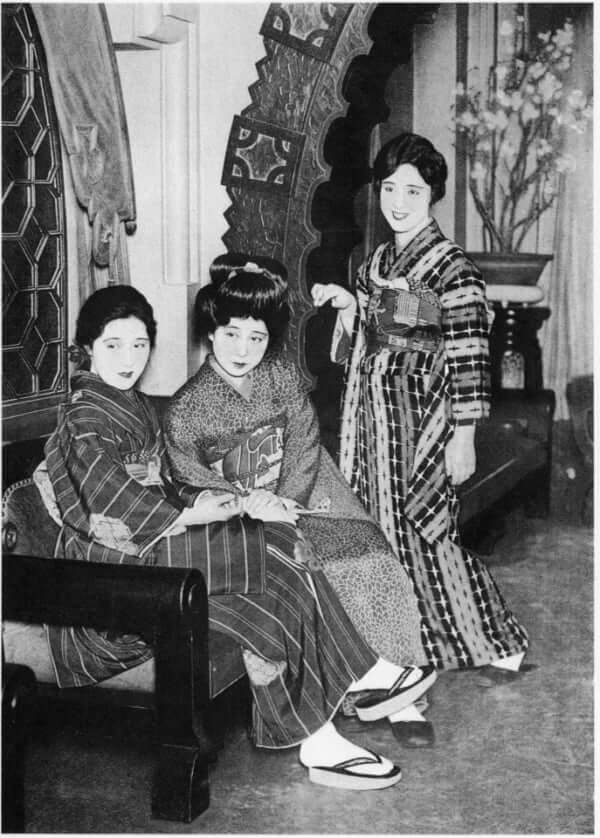 図10は、三人の女優がそろったところをとった写真である。奥から、滝花久子、夏川静江、伏見直江の順にならんでいる。いずれも1920年代後半からの日活を代表する名優たちである。奥の二人はスリッパ履きで、その場にのぞんでいた。手前の伏見は、足に草履をひっかけている。ここでも、草履とスリッパが同一の床に併存しえたことは、よくわかる。