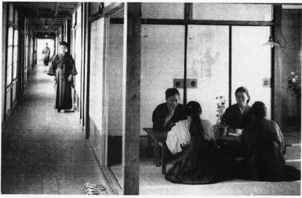 図11は広島にある上下高女の寄宿舎で、撮影された。大正時代の記録写真である。女学生たちは、畳の部屋につどい裸足ですわっている。あるいは、足袋ばきで。そして、部屋の外をとおる廊下に、草履をならべていた。この廊下は草履で歩いたことが、よくわかる。