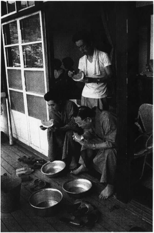 ここで骨休めをする男たちが、スイカをたべている。廊下に金盥をおき、そこへ種をはきすてていた。