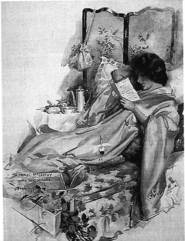 ソファに体を横たえた女性は、手紙を読んでいる。恋人、あるいは夫からの便りであろう。自宅の室内で、彼女はガウンをはおっていた。袖の袂が大きくふくらんでいる。鶴の模様も、そこをかざっていた。和装風と言ってよいガウンである。20世紀初頭におけるジャパニズムを反映する一枚ではあったろう。