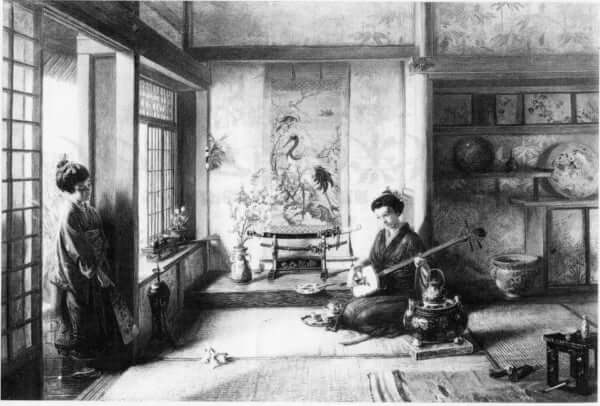床の間のしつらいなどは、正確にあらわしていた。やはり、じっさいに日本を見聞した人の理解はひいでている。私などは、そう言いたくなる。しかしイギリスのある美術研究者はこの絵に、つぎのような指摘をそえた。
