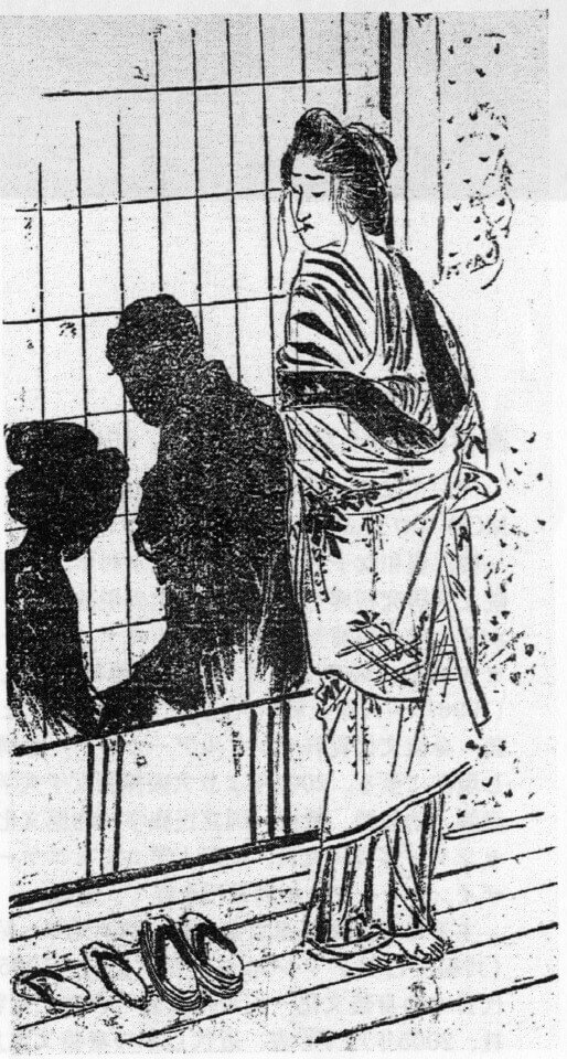 図7は根津遊廓にある、さる貸座敷の玄関先をあらわしている。『探偵実話 法衣屋お熊』という連載の挿絵である。やはり、『都新聞』(1895年12月4日付)にのせられた。玄関の奥には、来客用の草履がならんでいる。それらが今のスリッパと、用途面でつうじあうことは、こういう図から読みとれよう。