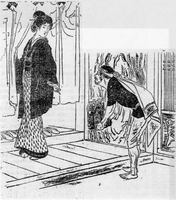 手前の男は人力車夫であった。往来では、裸足のままはたらいている。とうぜん、この玄関にはあがれない。むきあう女はヒロインのお熊である。彼女は人力車でこの貸座敷へのりつけた。そして、式台の上から土間の車夫へ用事を言いつけている。ねんのため、情景の説明をおぎなった。