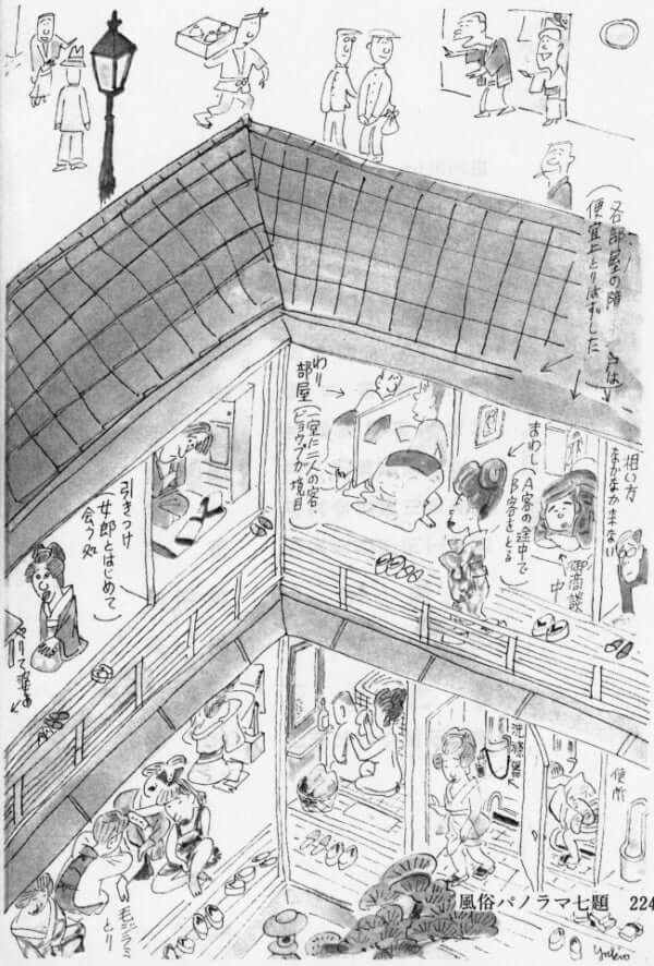 漫画家の杉浦幸雄に、「情事のある風景」という作画がある(図8)。「昭和十年代」の色街で、娼妓たちが部屋へ出入りする絵になっている。見れば、彼女たちは、庇の下にある廊下へ、履き物をのこしていた。草履や、それからスリッパも、畳をしいた部屋の外側へ、ならべている。ある時期まで、草履はスリッパのようにあつかわれたことが、見てとれよう。