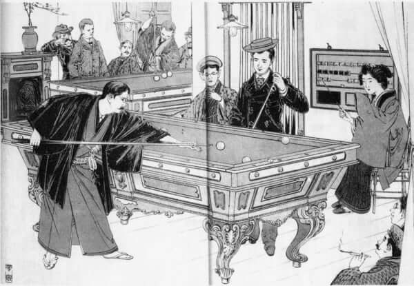 図9は19世紀末の玉突き、ビリヤードをえがいている。『世事画報』(1899年2月号)で披露された。左側の男は草履で玉をついている。右端で場を監視する女は、スリッパ履きである。草履の男とスリッパの女は、床面を共有した。同じ床の上に、草履とスリッパは共存しえたのである。