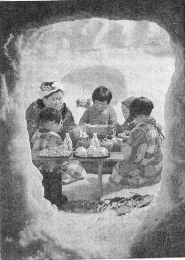 図11は、絵葉書の写真である。やはり、穴倉だが、防空壕のそれではない。戦前の秋田でうつされたかまくらが、被写体になっている。履き物の草鞋(わらじ)は、入口にならべられた。足の冷え込みやすい場所である。それでも、人びとは履き物をぬいでいる。日本人の民族的な住居観にしたがえば、ふつうはこうなるはずである。
