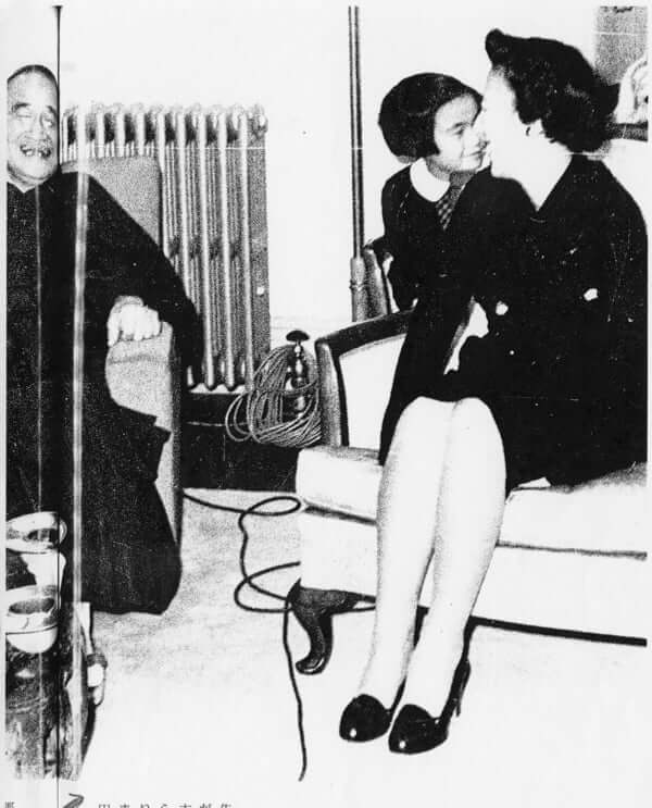 吉田のくらしぶりをつたえる写真は、少なくない。ここでは、自邸で家族と語りあう光景がうつった一枚の、その一部を紹介しておこう(図12)。ヒールをはいてソファーに腰をかけているのは麻生和子、吉田の娘である。外履きのままですごす習慣は、家族にもわかちあわれていたらしい。