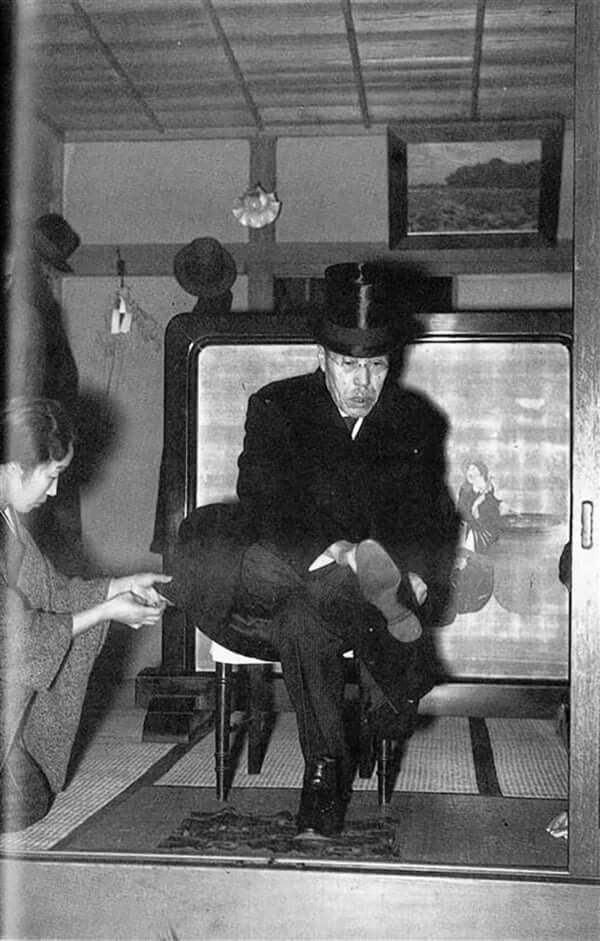 同年1月に組閣を命じられた平沼は、皇居の親任式へむかうため、家をでた。図7は、でかける前に靴をはく平沼がうつされた写真である。これを見るかぎり、玄関の三和土(たたき)ではない。靴に足先をとおしたのは、和室であった。絨鍛(じゅうたん)こそしいてある。しかし、この動作をくりひろげたのは、畳の上であった。