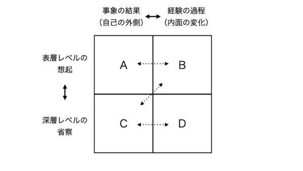 Aでは、起きた事象を客観的に記録する。Bでは、その事象に対して、自身がどのように感じたのかを観察する。Cでは、事象の原因や詳細の考察し、そしてDでは起きた事象が自分にとってどのような意味を持つのかを省察する。ここでは「表層・外側」(A)から「深層・内面」(D)へと、徐々に潜るように意識して記述することで、問いが深まることが期待される。