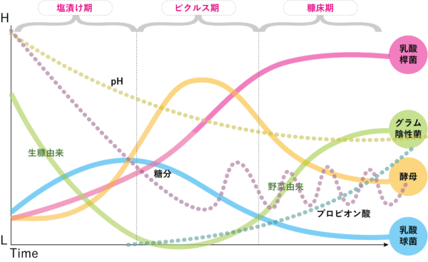 東京に戻った後に、リヨン滞在を共にした小倉ヒラクさんと話し合い、糠床を動かす前段階として、発酵状態をセンサーで検知する実験から始めようと決めた。ヒラクさんには糠床に関する多くの学術論文から、新たに仕込んだ糠床が十分に熟成したと判断できる基準を抽出してもらった。約一ヶ月後に届いたのは、糠床の辿る理想的な熟成プロセスの仮説モデル図だった。微生物の種類ごとに、時間の経過に伴って勢力がどう変わるのかが描かれている。初期に優勢な乳酸球菌が徐々に乳酸桿菌に置き換わり、糠床のpH値が下がっていく(酸性が強くなる)。この図を眺めているだけで、糠床の中の生態系が動いていく様子が想像できた。