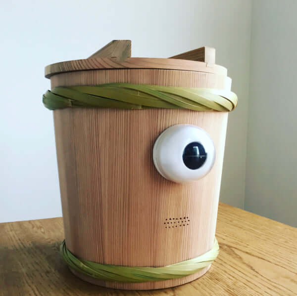 木桶に目玉が付いたこの瞬間のことを、よく覚えている。杉材の木目が走る桶の側面に、ぎょろりとした目玉がひとつ。それだけで、Nukabotがまったく別の存在に見えた。機械ではなく、何か謎めいた生き物のよう。ミラノのNukabotは人間が一方的に使う道具に見えたのだが、目玉の付いたNukabotは独自の意志を持つ他者のように映った。